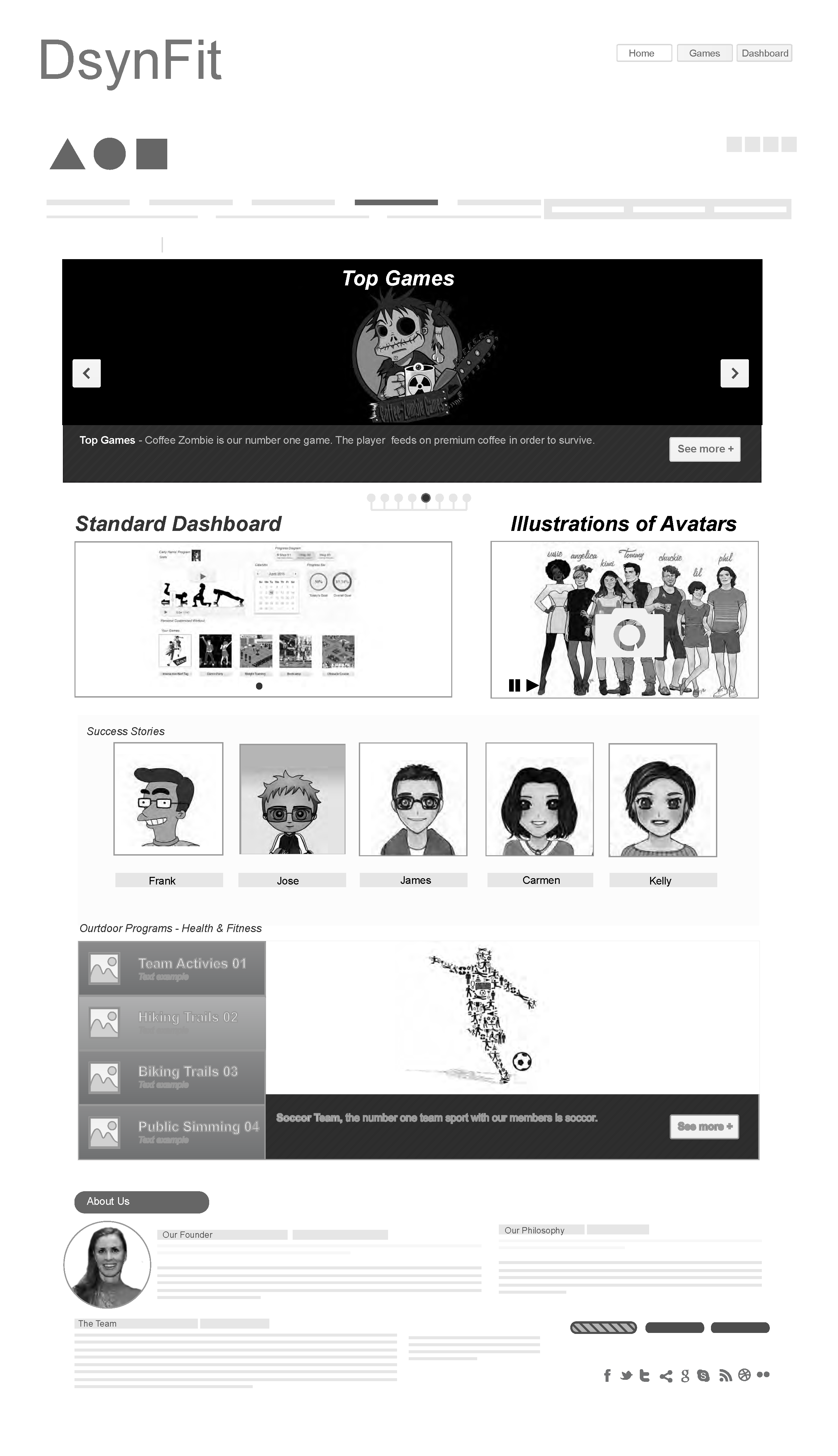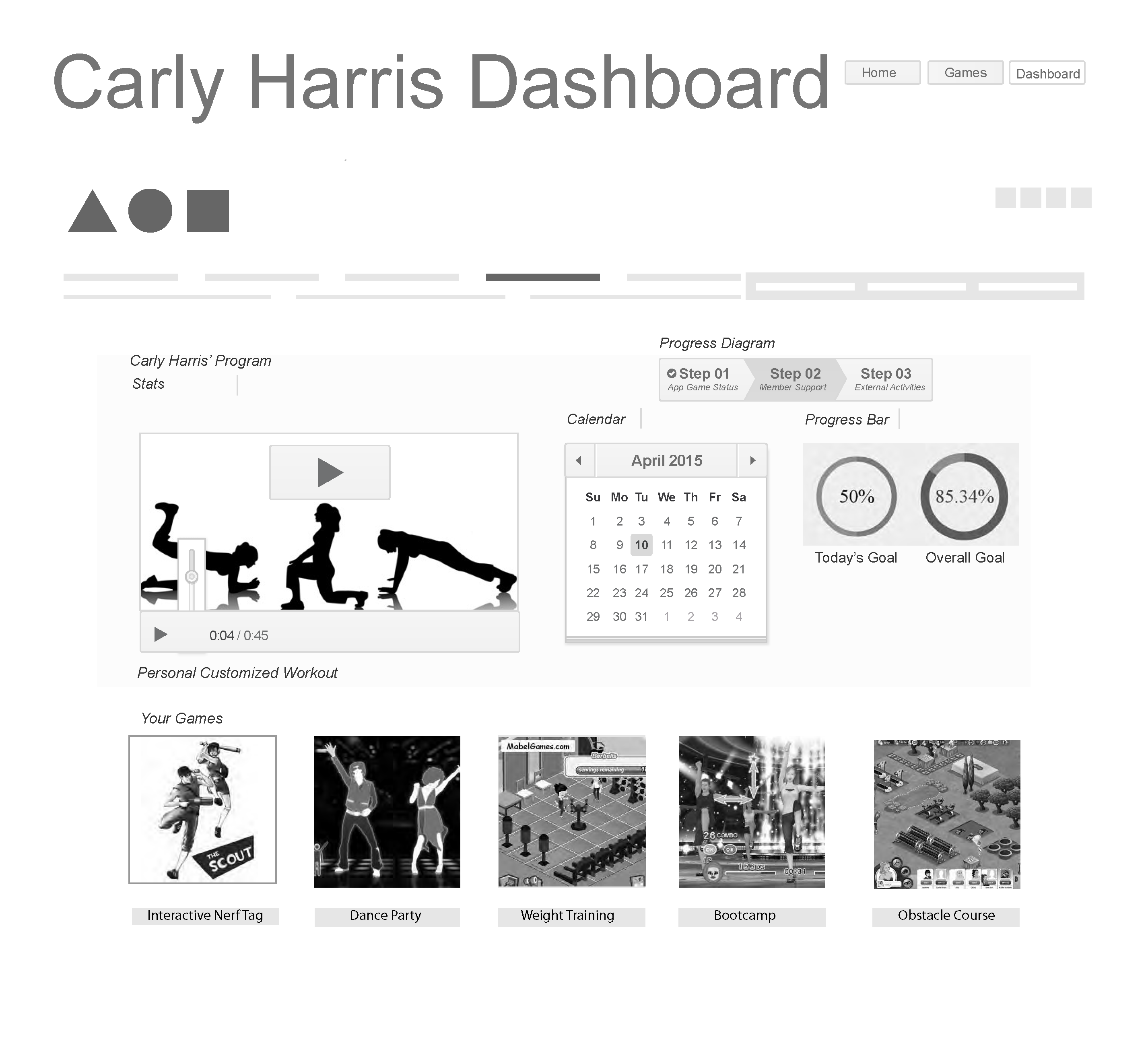 The linked wireframes were created in Illustrator for a gaming fitness website during my coursework this semester at CCSF.